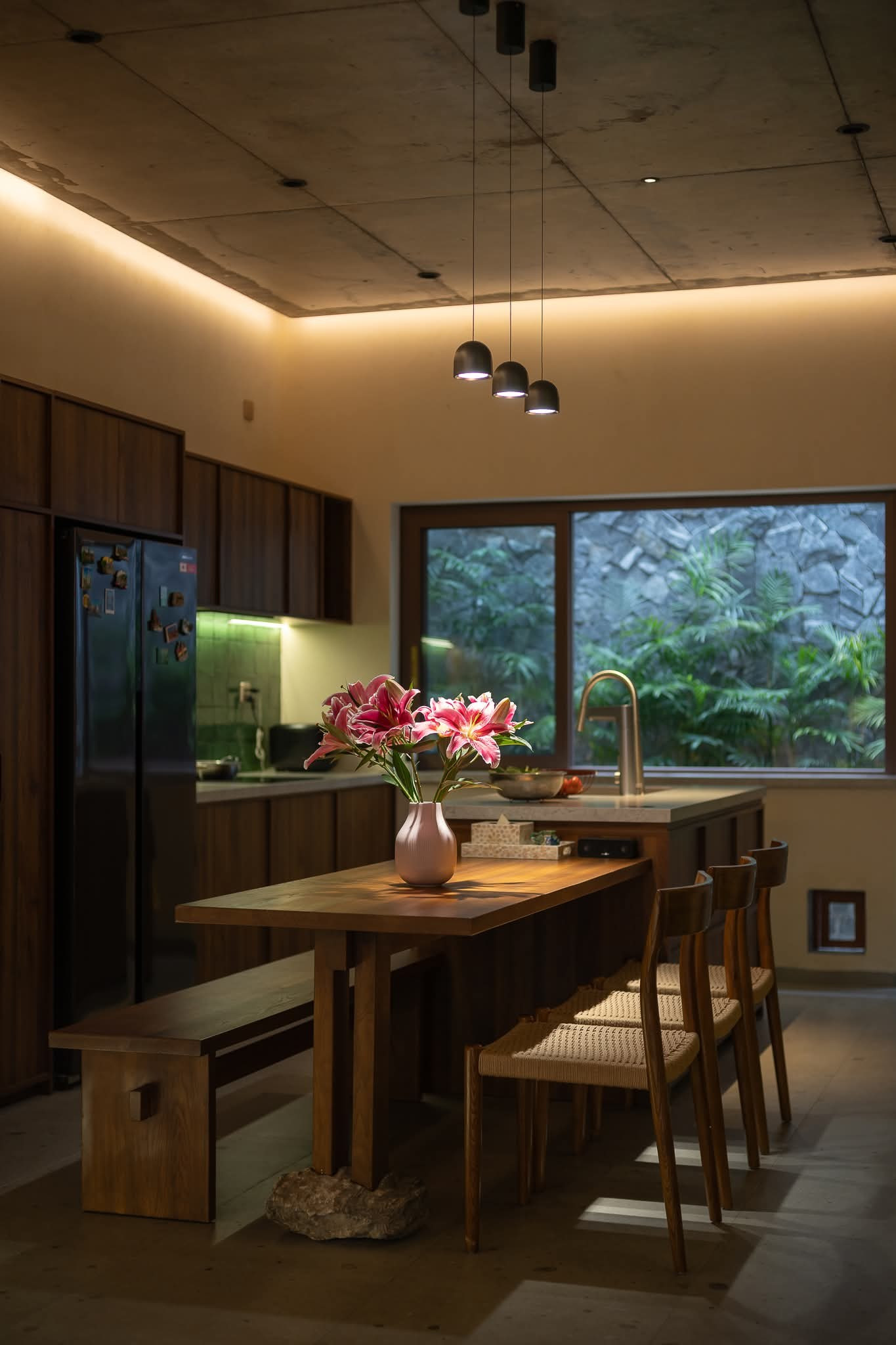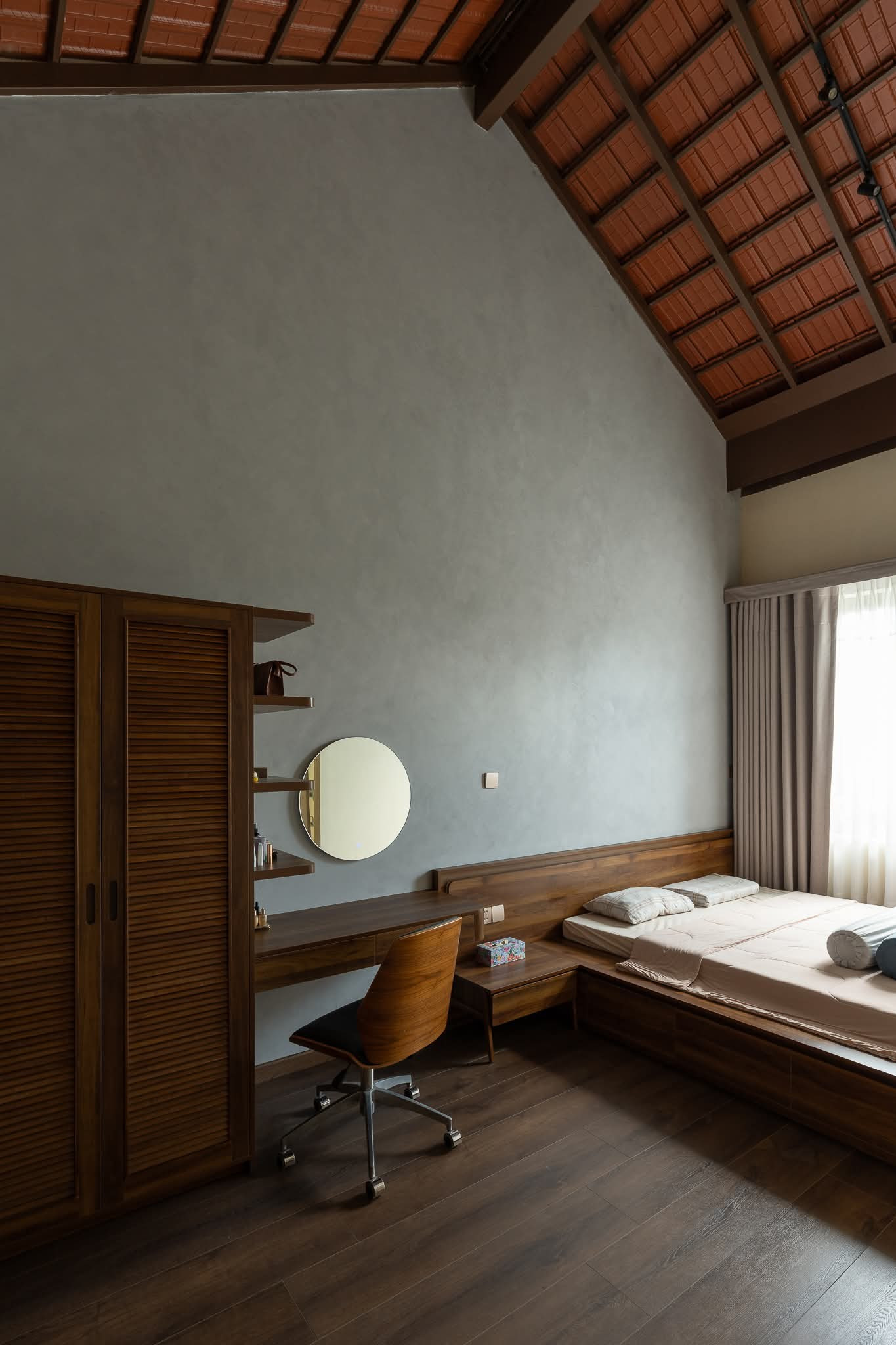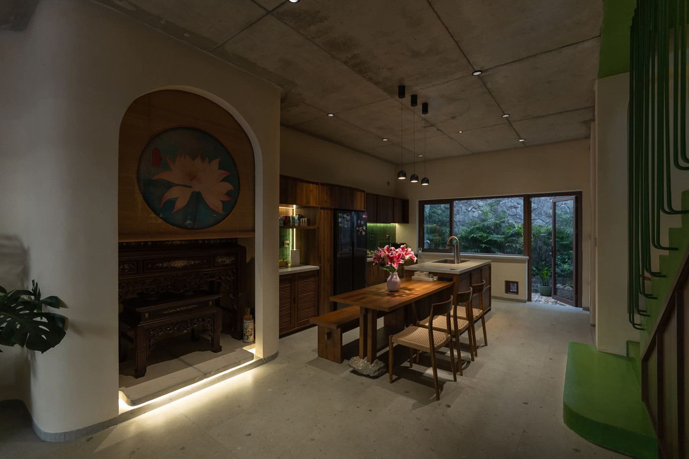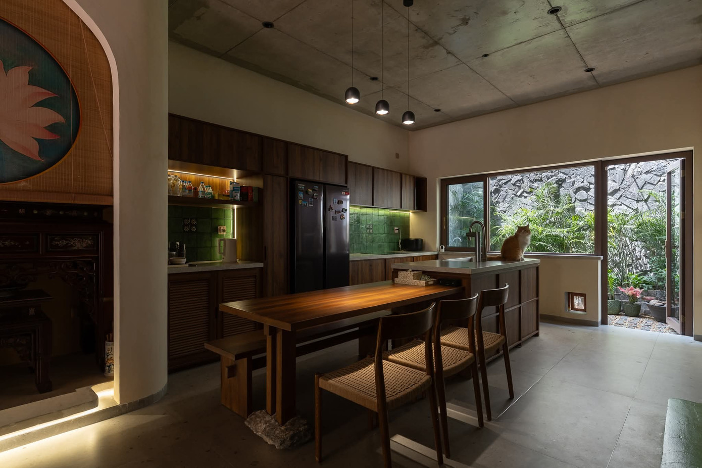 Ánh sáng tự nhiên được sắp đặt khéo léo, thông qua các lớp cửa kính, len qua từng viên ngói, biến sinh hoạt thường ngày thành khoảnh khắc giao hòa cùng thiên nhiên.