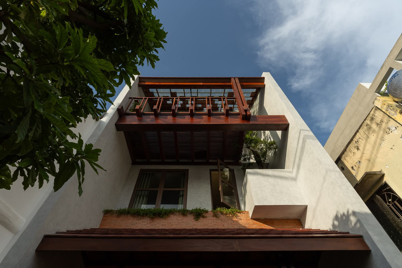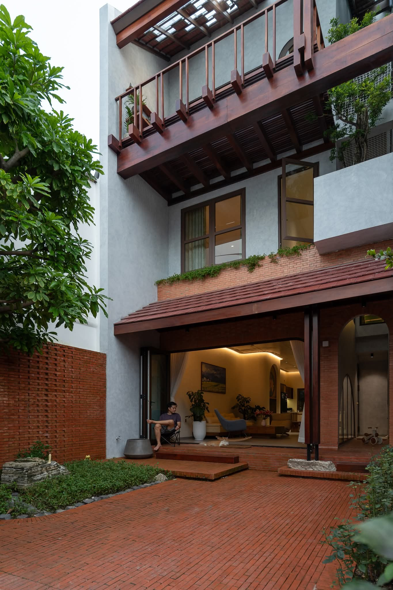 Công trình mang đến cảm giác thân thuộc ngay từ hình ảnh mái ngói xưa được tái hiện trên nền kiến trúc hiện đại. Từng khoảng hiên, ban công gỗ và hệ mái kép không chỉ làm đẹp hình khối công trình mà còn mở ra nơi trú ẩn bình yên.