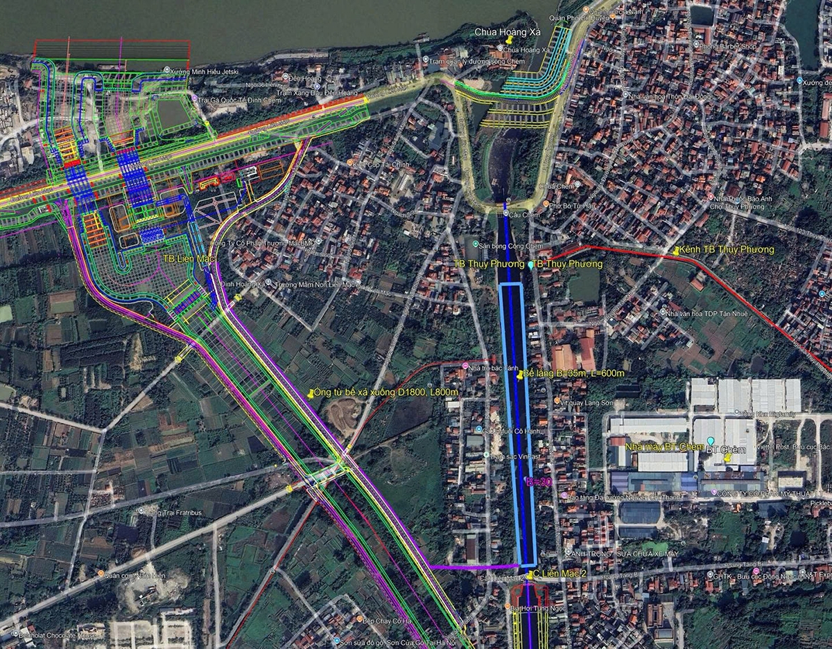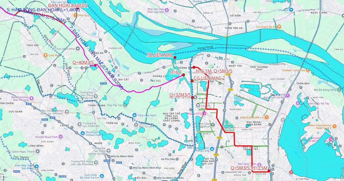 Đoạn đường đỏ dự kiến là hướng tuyến đường dẫn nước từ sông Hồng đến sông Tô Lịch