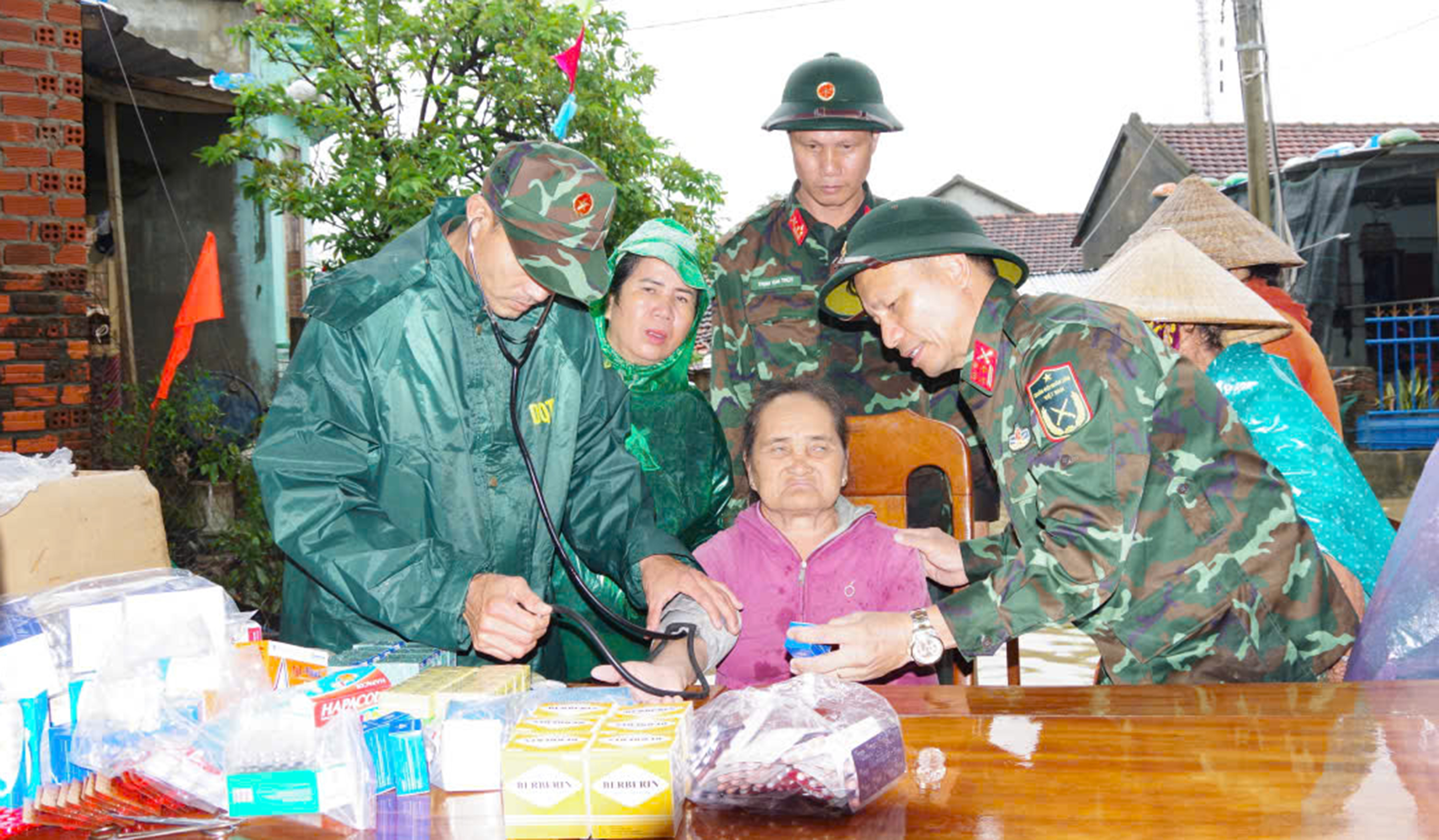 Quân y khám bệnh cho người già vùng ngập lụt xã Hòa Tâm
