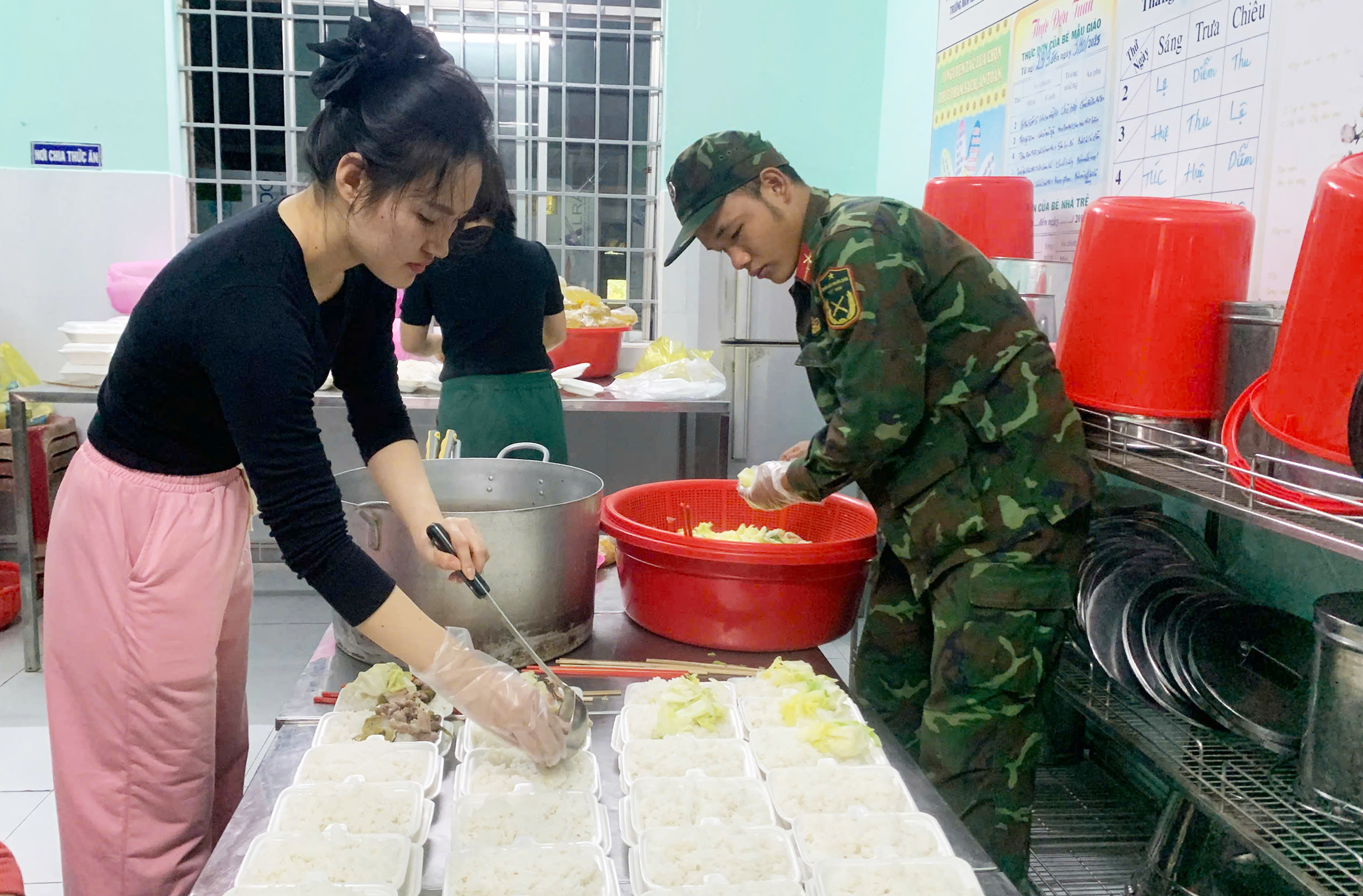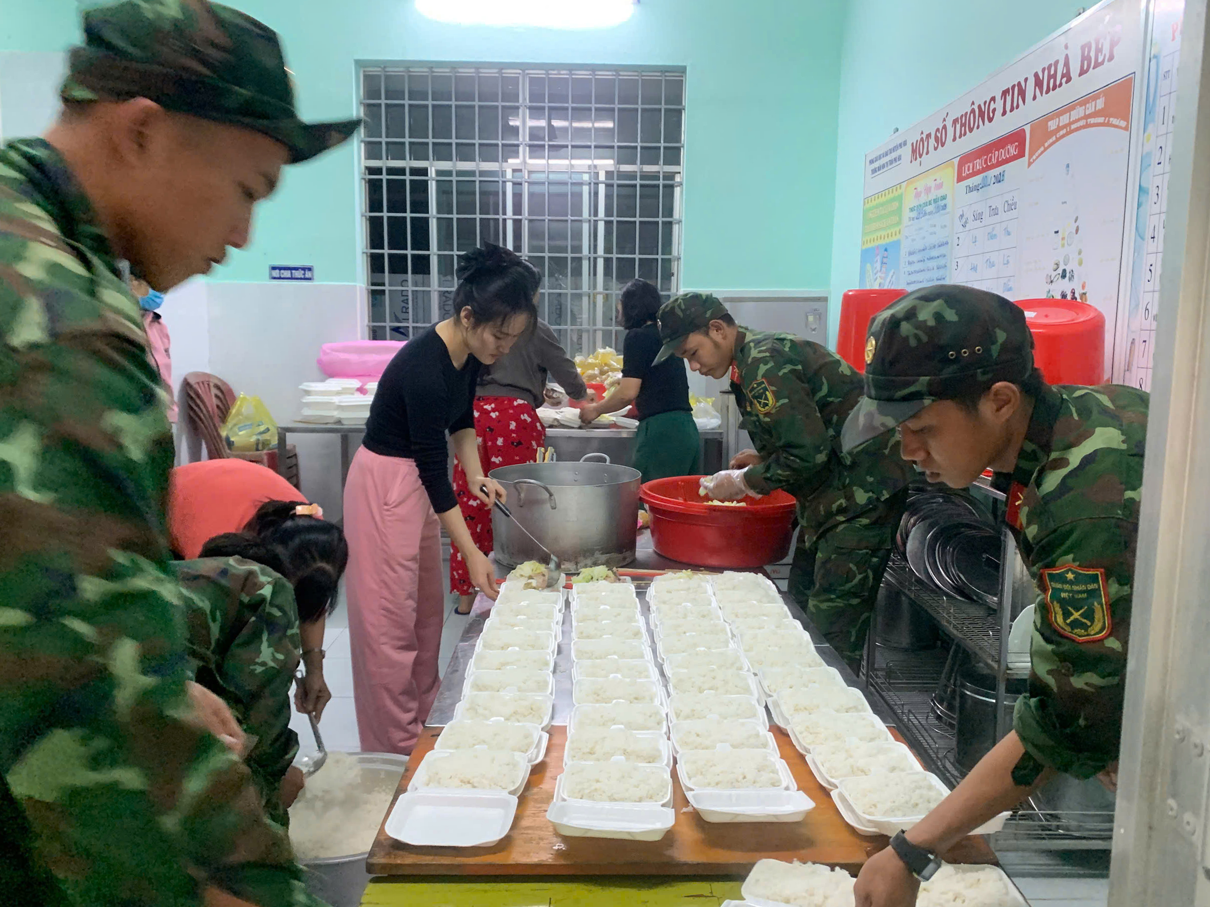 Thực phẩm do Trung đoàn mang theo và thu mua nhanh quanh vùng. Vừa đảo nồi canh lớn, Hạ sĩ Y Ja Niê (Tiểu đoàn 303, Trung đoàn 584) nói: “Có tới nơi mới thấy bà con cực thế nào. Anh em quen thao trường giờ cầm muôi nấu cơm, chỉ mong làm nhanh nhất để kịp gửi tới từng nhà”.