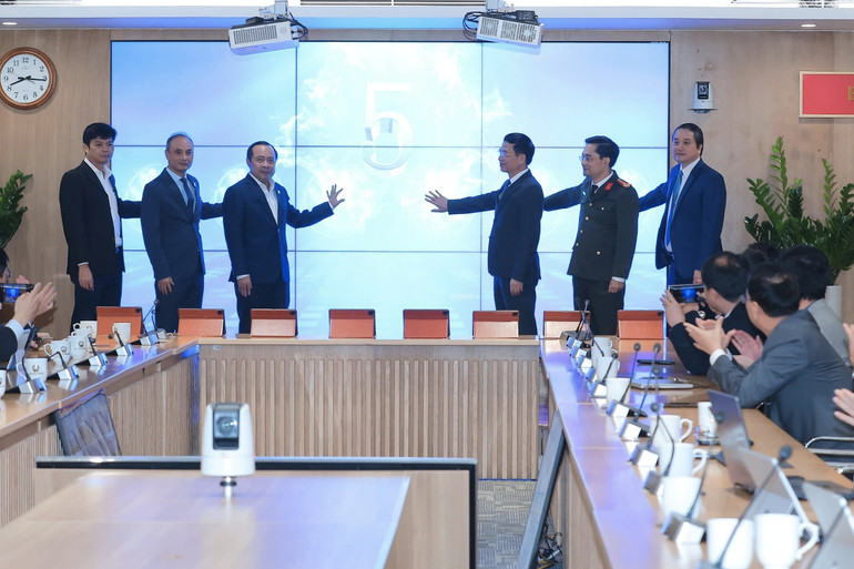 Các đại biểu khai trương Hệ thống quản lý trực tuyến các nhiệm vụ khoa học, công nghệ theo thời gian thực.