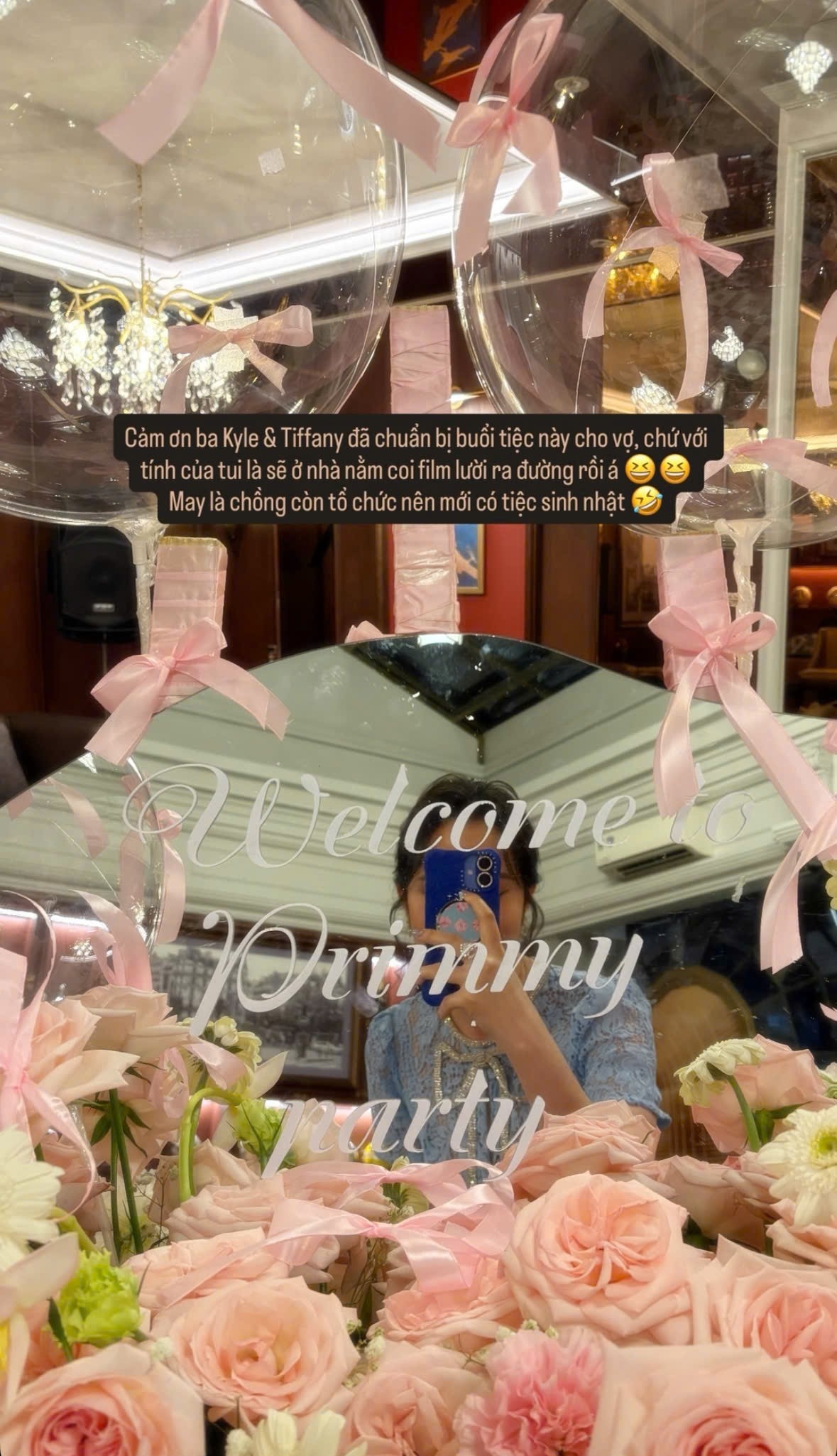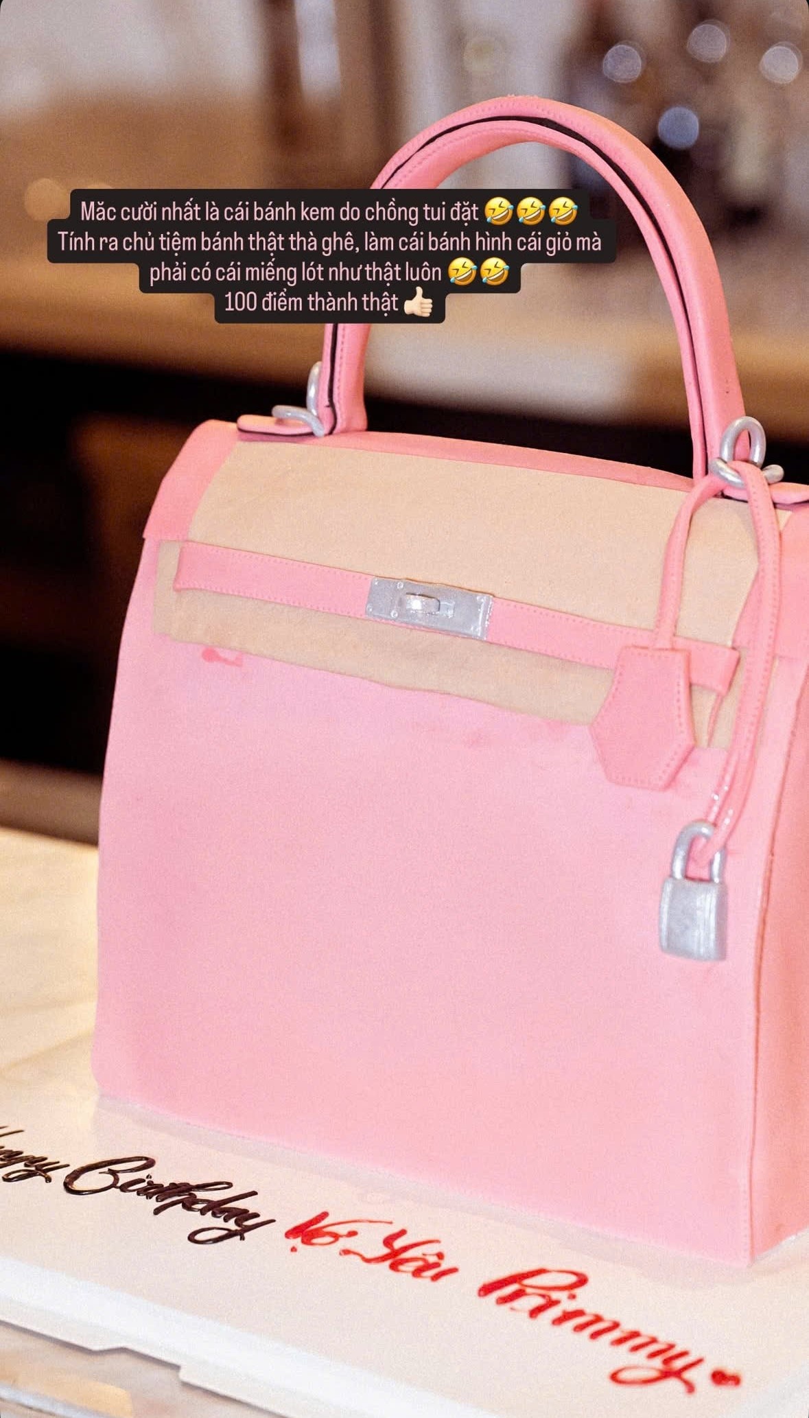 Nữ beauty blogger bày tỏ hạnh phúc khi được chồng quan tâm, nói vui rằng nếu anh không tổ chức bữa tiệc, hẳn cô sẽ "ở nhà nằm coi phim, lười ra đường". Điều khiến cô bất ngờ hơn cả là chiếc bánh kem được thiết kế mô phỏng chiếc túi Hermès màu hồng.