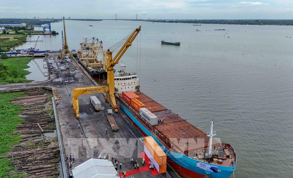 Hiện luồng hàng hải vào cảng Cái Cui còn hạn chế khiến tàu lớn trên 10.000 DWT đầy tải không thể vào luồng sông Hậu, làm giảm khả năng kết nối trực tiếp với các thị trường quốc tế. Ảnh: Thanh Liêm - TTXVN