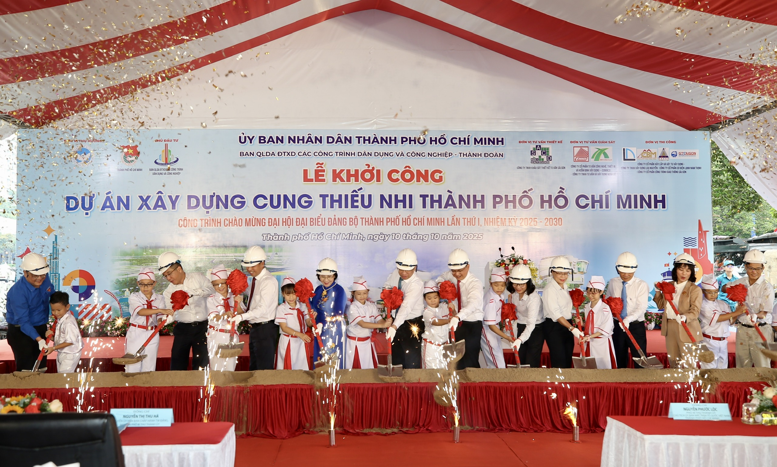 Lãnh đạo TPHCM cùng các khách mời thực hiện nghi thức động thổ, khởi công dự án Cung Thiếu nhi TPHCM. Ảnh: DŨNG PHƯƠNG
