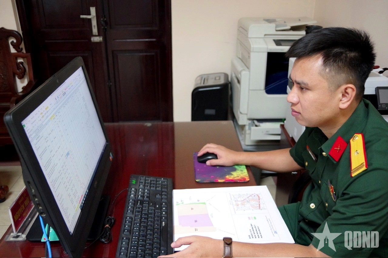 Thiếu tá Nguyễn Hữu Vũ nghiên cứu sáng kiến ứng dụng công nghệ thông tin trong công tác quản lý, sử dụng đất quốc phòng.