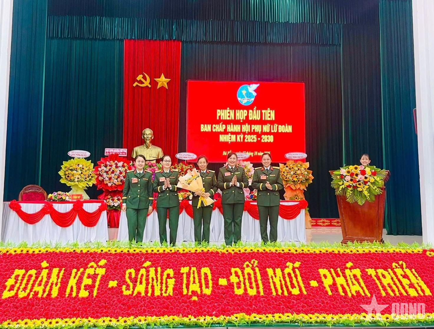 Thiếu tá QNCN Trần Thị Mai Trang (chính giữa cầm hoa) tham dự phiên họp đầu tiên của Ban Chấp hành Hội Phụ nữ Lữ đoàn Thông tin 575 nhiệm kỳ 2025 - 2030.