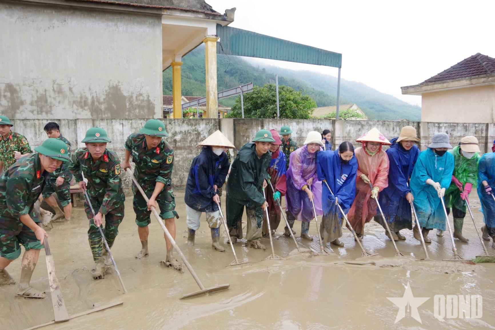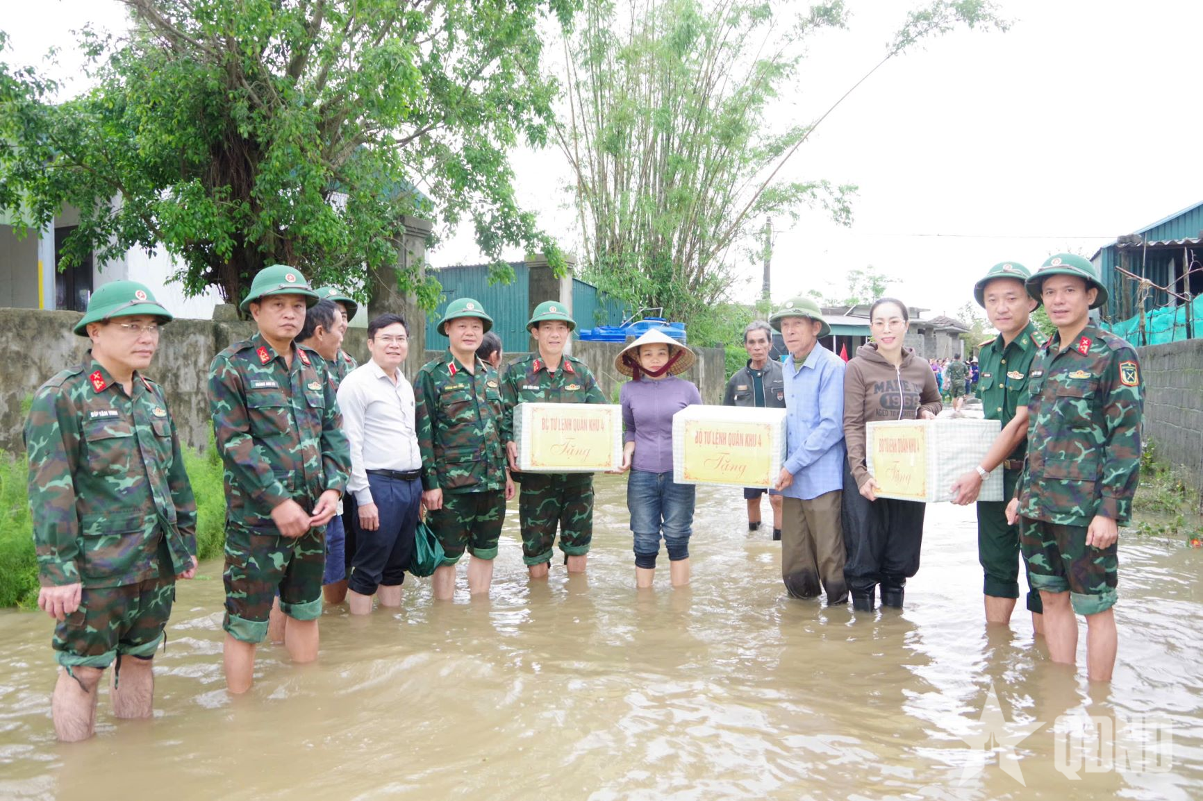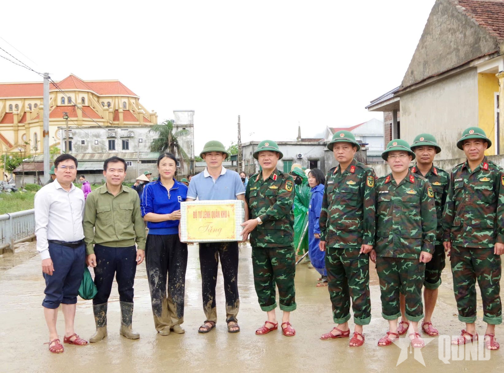 Đoàn công tác Quân khu 4 trao hỗ trợ cho các lực lượng cứu hộ và bà con nhân dân.