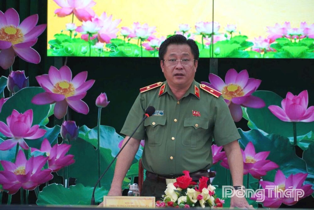 Thiếu tướng Lâm Phước Nguyên, Ủy viên Ban Thường vụ Tỉnh ủy, Giám đốc Công an tỉnh Đồng Tháp phát biểu tại buổi làm việc.