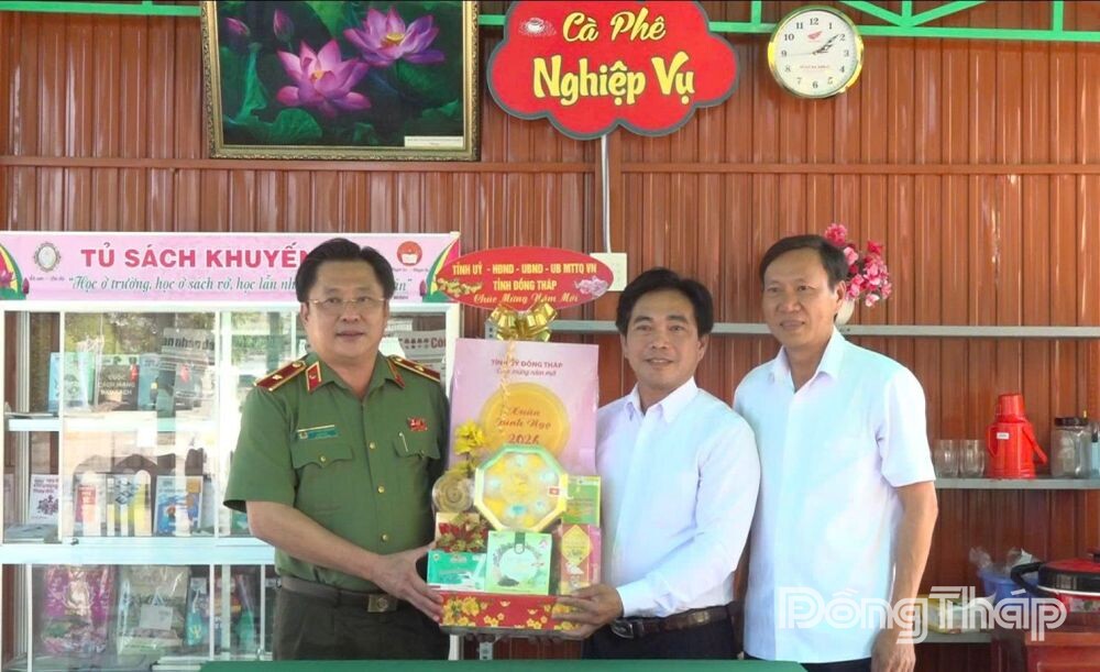 Thiếu tướng Lâm Phước Nguyên, Giám đốc Công an tỉnh Đồng Tháp tặng quà cho lãnh đạo Đảng ủy, UBND xã Mỹ An Hưng nhân dịp Tết Nguyên đán Bính Ngọ 2026.