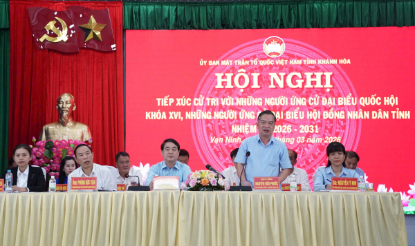 Thiếu tướng Nguyễn Hữu Phước tại buổi tiếp xúc cử tri xã Vạn Ninh thuộc đơn vị số 1, tỉnh Khánh Hòa.