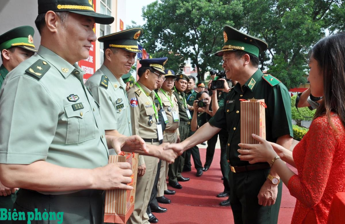 Thiếu tướng Trịnh Hoàng Hiệp tặng quà lưu niệm cho Đoàn đại biểu lực lượng bảo vệ biên giới Trung Quốc, Lào, Campuchia, Myanmar, Thái Lan tham gia chương trình “Biên cương thắm tình hữu nghị” lần thứ III.