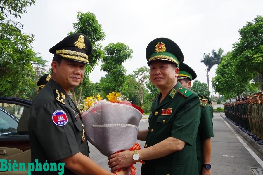 Thiếu tướng Trịnh Hoàng Hiệp tặng hoa Đại tướng Hun Manet, Phó tổng Tư lệnh Quân đội Hoàng gia Campuchia, Tư lệnh Lục quân Quân đội Hoàng gia Campuchia (nay là Thủ tướng Campuchia) nhân chuyến thăm Học viện Biên phòng của Đoàn đại biểu Lục quân Quân đội Hoàng gia Campuchia.