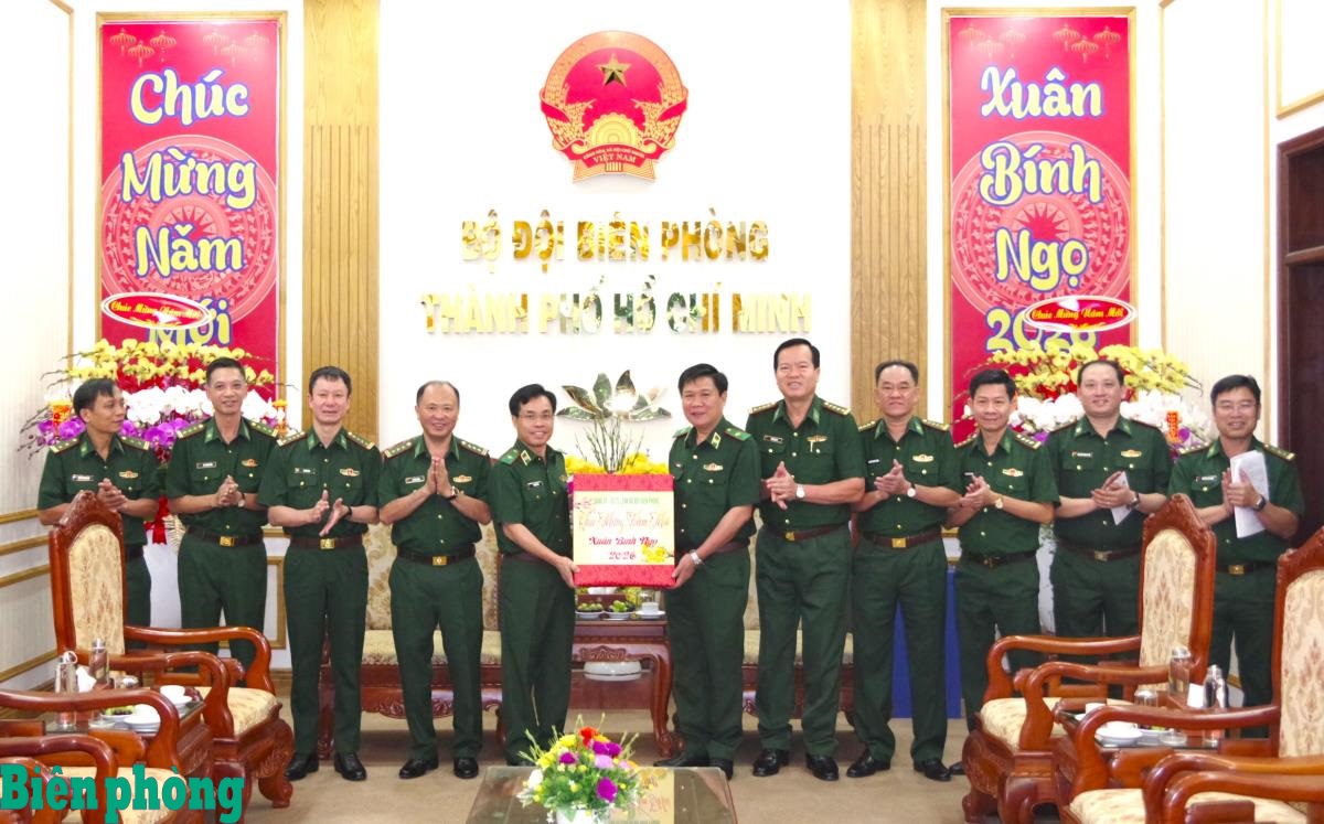 Thiếu tướng Vũ Quốc Ân (thứ 5, từ trái sang) và đoàn công tác Bộ Tư lệnh trao quà, chúc Tết Ban Chỉ huy Bộ đội Biên phòng thành phố Hồ Chí Minh. Ảnh: Lê Khoa
