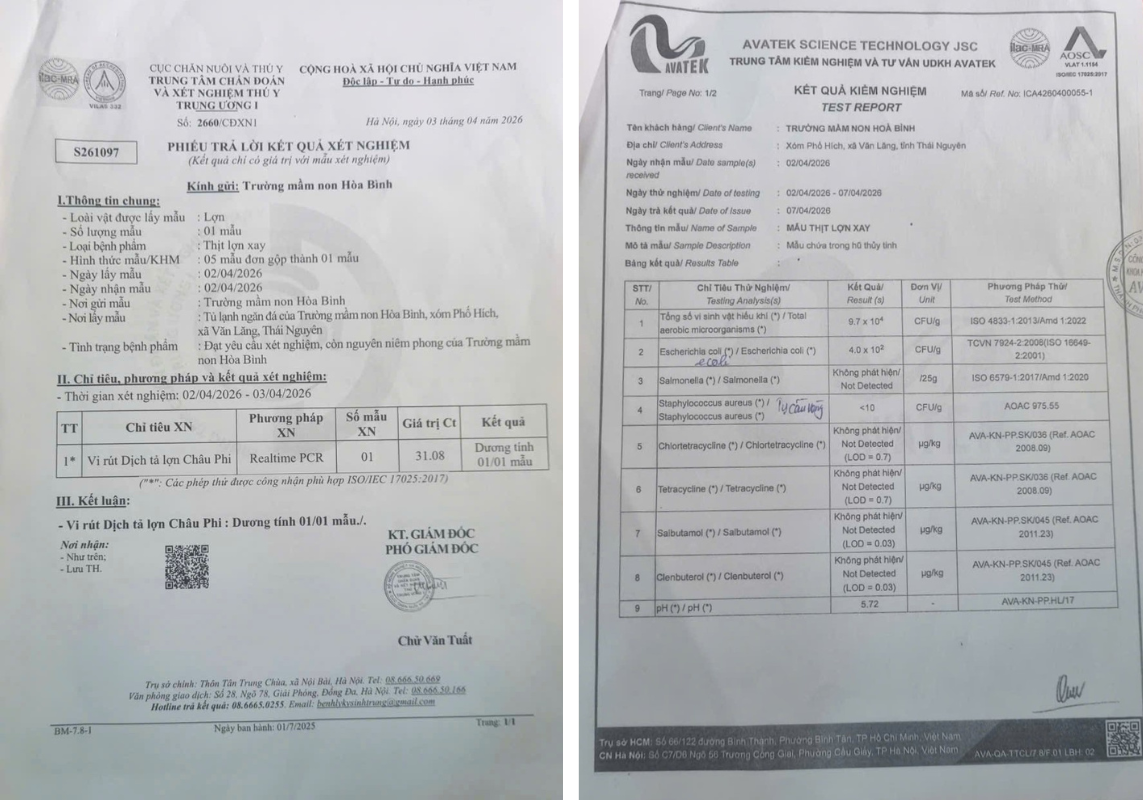 Kết quả xét nghiệm vụ thịt lợn bất thường tại Trường mầm non Hòa Bình.