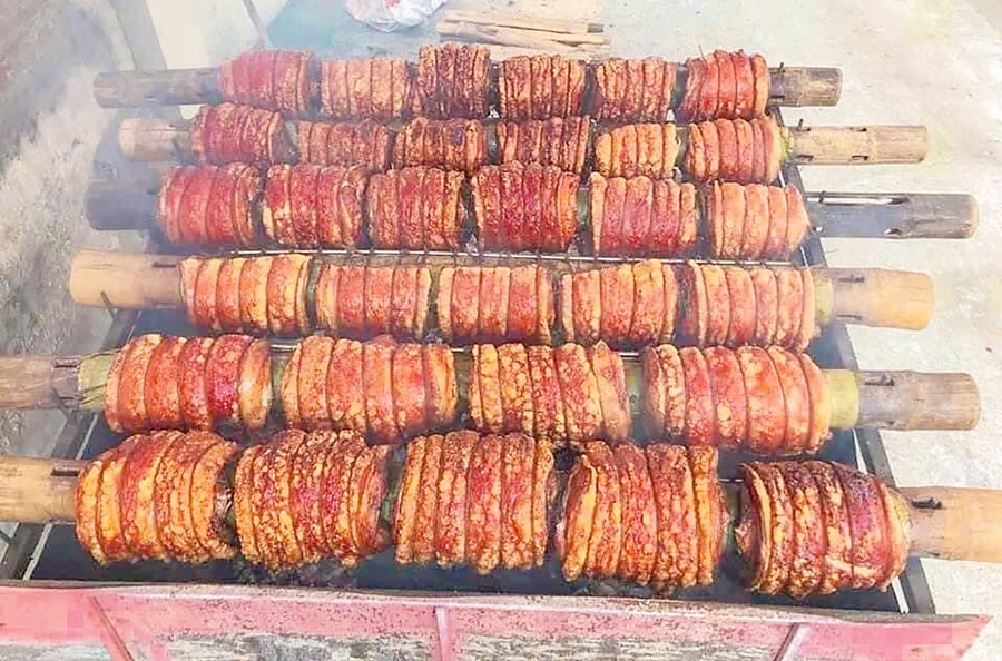 Thịt quay đòn được chế biến từ những phần thịt ngon như ba chỉ hoặc thịt vai, có sự cân đối giữa nạc và mỡ để tạo độ mềm và béo vừa phải. Sau khi sơ chế, thịt được tẩm ướp bằng các gia vị quen thuộc như muối, tiêu, hành khô, đôi khi thêm mật ong hoặc mạch nha để tạo màu vàng óng và vị ngọt nhẹ. Điều đặc biệt nằm ở công đoạn quay: Miếng thịt được xiên vào một thanh tre dài - gọi là “đòn”, rồi quay đều trên bếp than hồng.
