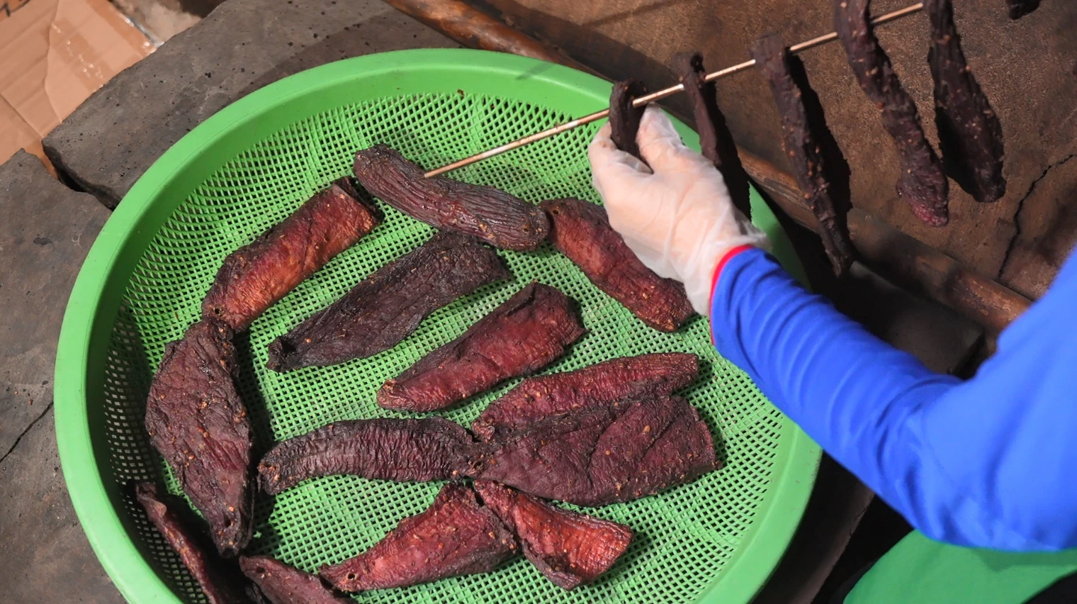 Khi thịt đã thấm gia vị, bà con xiên từng miếng vào que tre, rồi treo lên gác bếp để sấy. Quá trình hun khói được duy trì liên tục, lượng khói và nhiệt độ ở mức vừa phải để thịt khô đều, giữ hương thơm mà không bị ám khói nặng. Sau khi sấy, thịt tiếp tục được đồ trong chõ gỗ để làm chín, giúp thớ thịt mềm hơn nhưng vẫn giữ độ dai.
