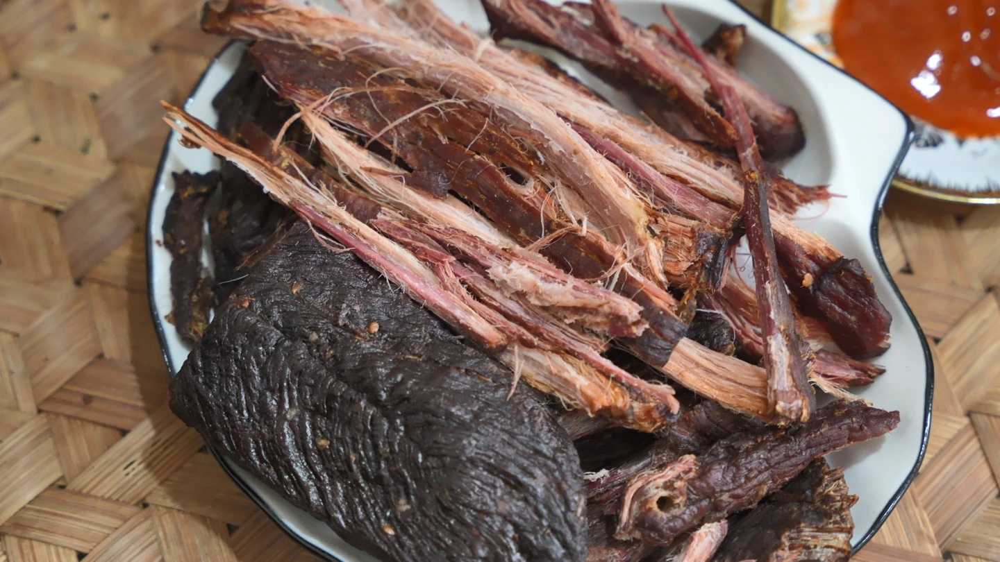 Thịt trâu gác bếp đạt yêu cầu có màu đỏ sẫm bên ngoài, thơm mùi khói
