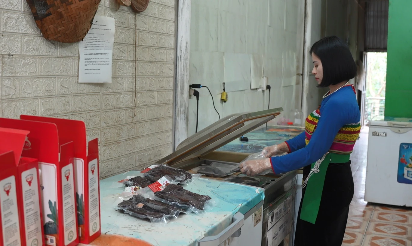 Thịt trâu gác bếp được đóng gói, hút chân không được nhiều du khách lựa chọn làm quà biếu tặng