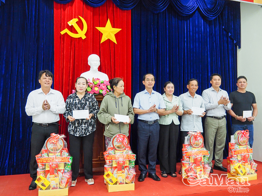 Đồng chí Hồ Thanh Thủy, Phó Bí thư Tỉnh ủy, Chủ tịch Ủy ban MTTQ Việt Nam tỉnh Cà Mau (thứ năm từ phải sang), cùng lãnh đạo Xã Phan Ngọc Hiển tặng quà các gia đình chính sách đang thờ cúng các liệt sĩ trong cuộc Khởi nghĩa Hòn Khoai.