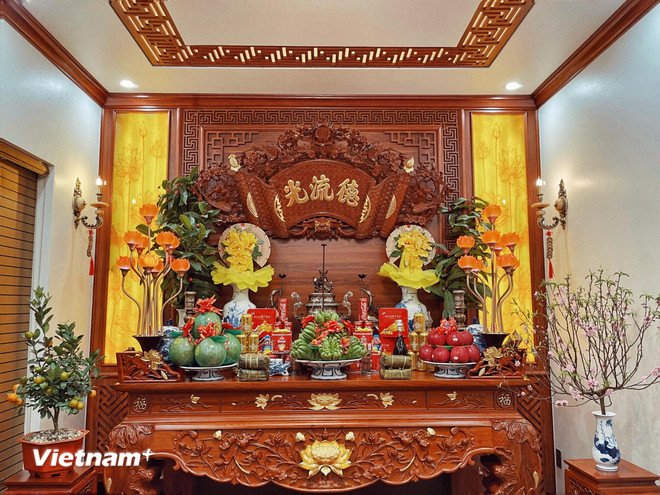 Bàn thờ gia tiên ngày Tết được bài trí trang trọng, ấm cúng. (Ảnh: Vietnam+)