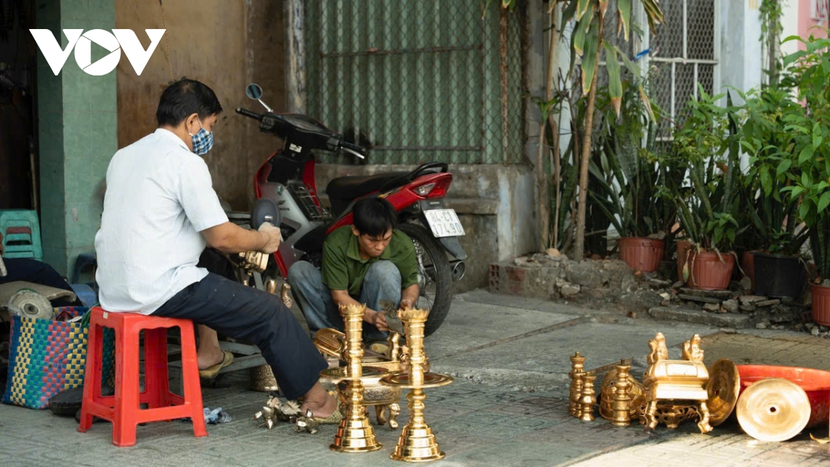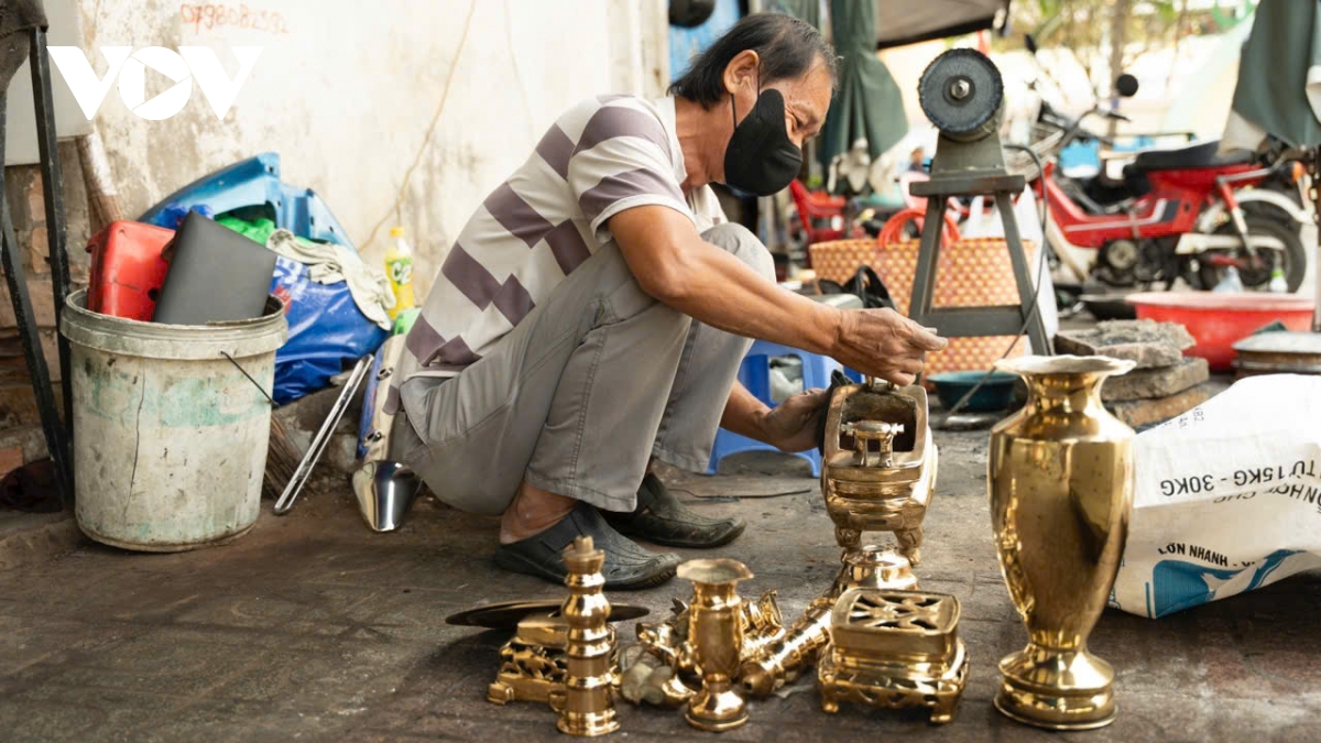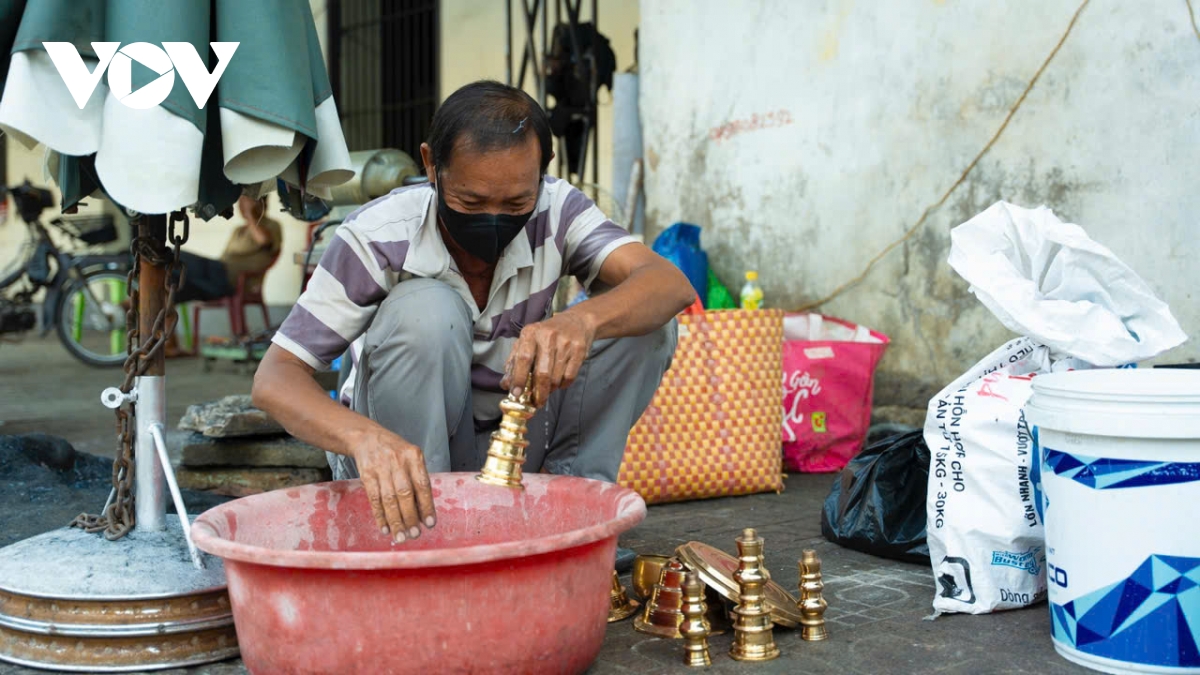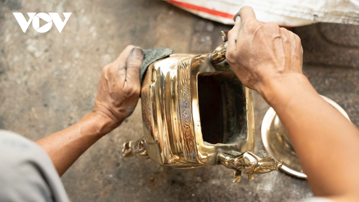 Còn với ông Phú Tài (58 tuổi), một thợ đánh bóng lư đồng với 15 năm gắn bó với nghề cho biết, càng cận Tết, lượng khách đổ về càng đông. Những ngày cao điểm, ông nhận từ 10-15 bộ lư mỗi ngày.