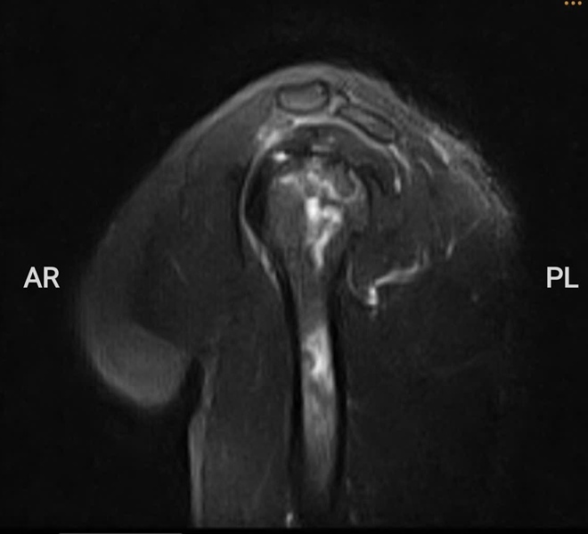 Hình ảnh chụp MRI cho thấy bệnh nhân bị hoại tử chỏm xương cánh tay trái, ổ hoại tử lan xuống vùng cổ và thân xương cánh tay.