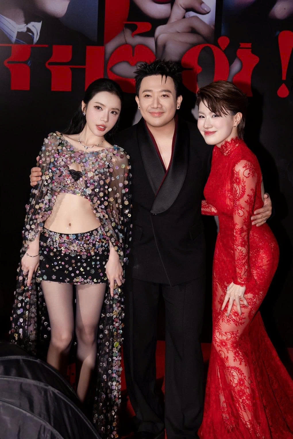 Đạo diễn Trấn Thành (giữa) cùng hai diễn viên phim "Thỏ ơi!!" - Lyly (trái) và Pháo. Ảnh: ĐPCC