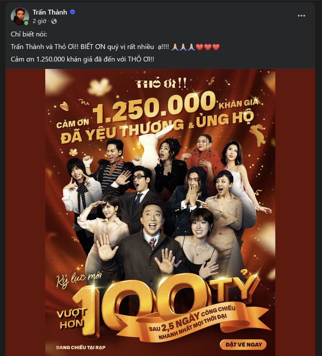 Đạo diễn Trấn Thành thông báo phim cán mốc 100 tỉ đồng trên trang cá nhân. Ảnh: Facebook