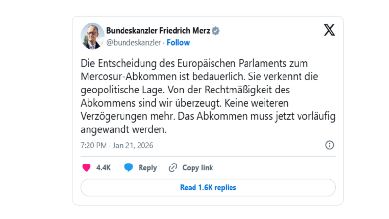 Thủ tướng Đức Friedrich Merz, một trong số những tiếng nói ủng hộ mạnh mẽ hơn cả việc phê chuẩn thỏa thuận này giữa những căng thẳng trong những tháng gần đây, cũng đã ngay lập tức chỉ trích cuộc bỏ phiếu của Nghị viện, gọi kết quả này là “đáng tiếc” và cho rằng nó “đánh giá sai tình hình địa chính trị”. Trên mạng xã hội, ông Merz viết: “Chúng tôi tin chắc vào tính hợp pháp của thỏa thuận. Không thể trì hoãn thêm nữa. Hiệp định phải được triển khai áp dụng tạm thời ngay từ bây giờ.”