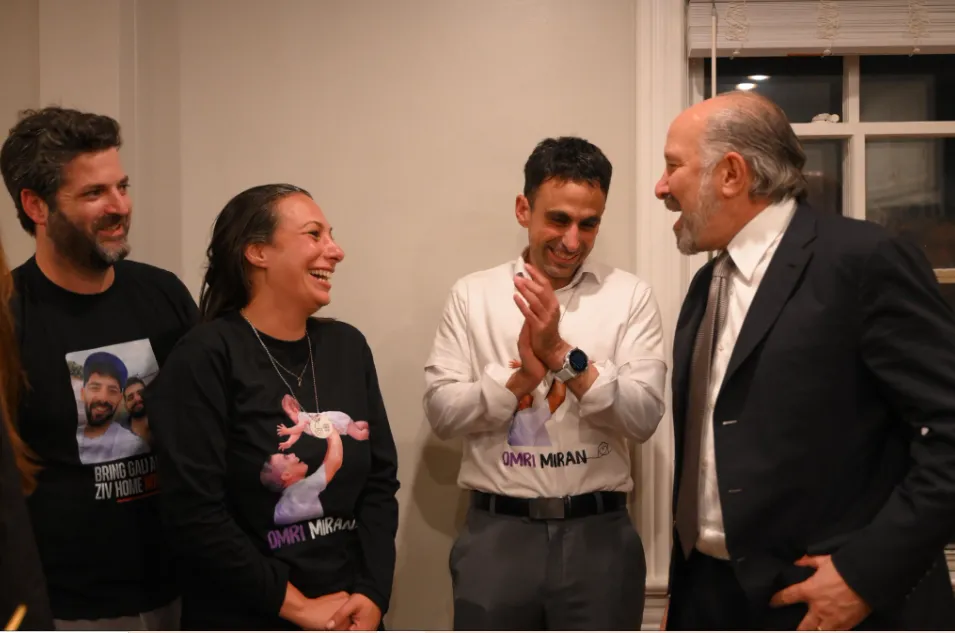 Bộ trưởng Thương mại Mỹ Howard Lutnick (bìa phải) cùng các gia đình có người thân là con tin bị Hamas bắt giữ vui mừng khi Israel-Hamas đạt được thỏa thuận ngừng bắn. Ảnh: X/BRING THEM HOME NOW