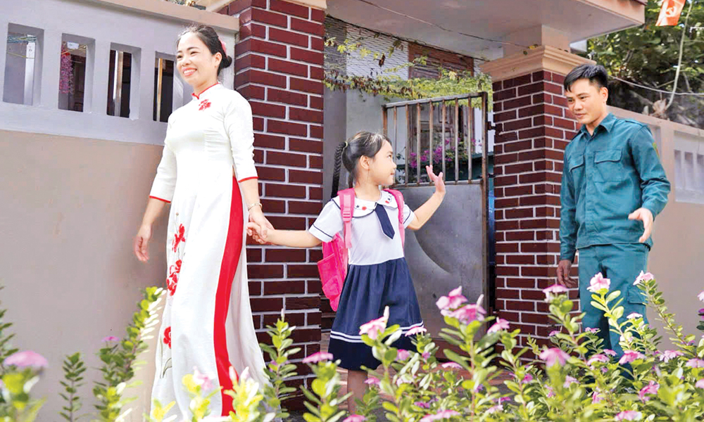 Phụ nữ mặc áo dài đưa con đi học ở đảo Đá Tây A.
