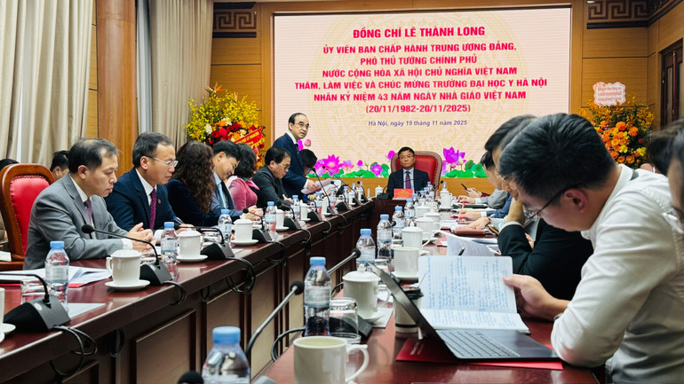 Phát biểu kết luận buổi làm việc, nhân dịp kỷ niệm 43 năm Ngày Nhà giáo Việt Nam (20/11), Phó Thủ tướng Lê Thành Long gửi tới các thầy giáo, cô giáo, các nhà khoa học, đội ngũ y bác sĩ cùng toàn thể học viên, sinh viên lời chúc mừng tốt đẹp nhất.