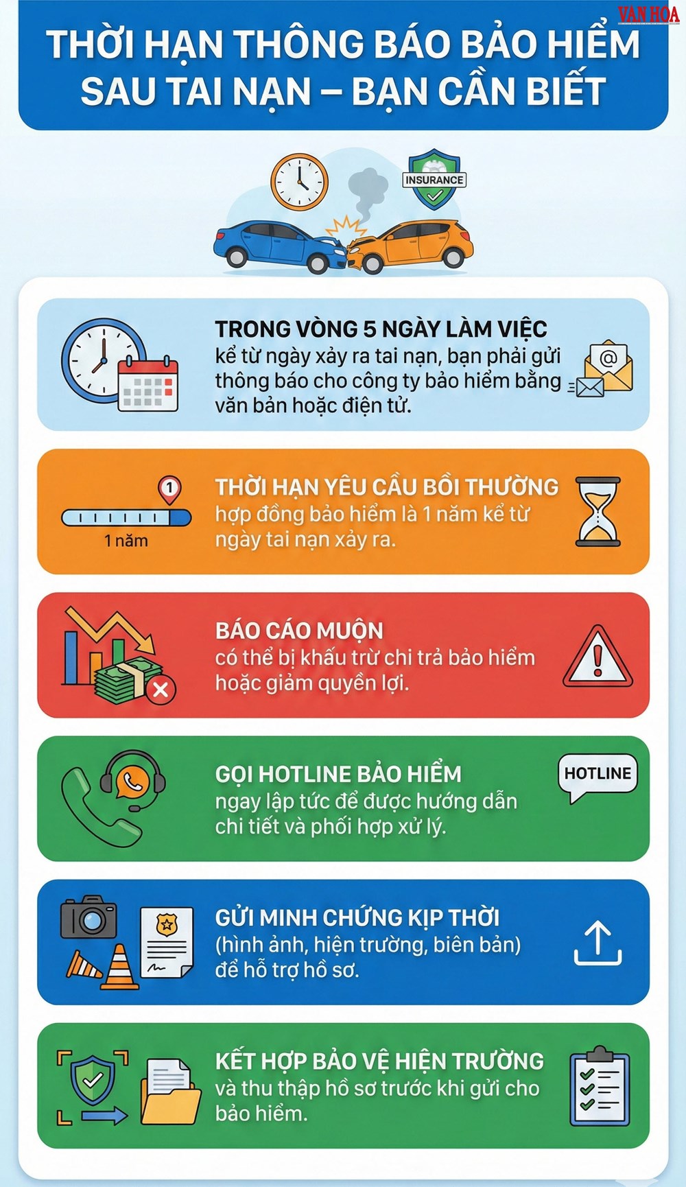 Trong trường hợp cần hỗ trợ y tế, cứu hộ hoặc an toàn hiện trường, hãy ưu tiên những bước này trước, nhưng không để quá hạn 5 ngày mới báo với bảo hiểm.