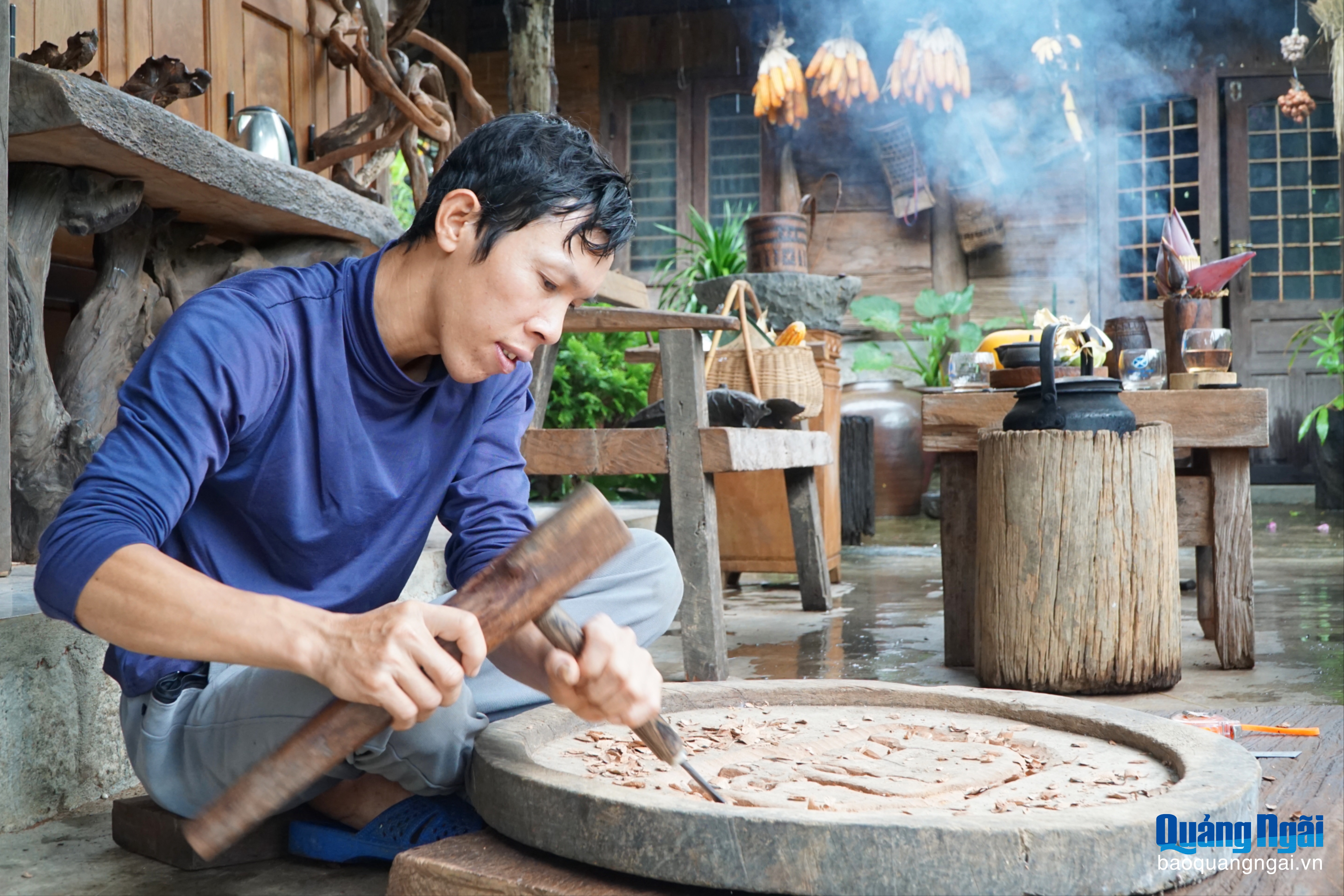 Không có điều kiện mua dụng cụ, anh đến tiệm phế liệu mua sắt vụn về tự mài giũa thành cây đục. Nguyên liệu cũng chỉ là những gốc cây nhãn, gốc mít quanh nhà. Ngày qua ngày, anh kiên trì tập tạc, mày mò từng đường đục, đẽo. Chính từ trải nghiệm ban đầu ấy, niềm đam mê với nghề được nhen nhóm trong anh.