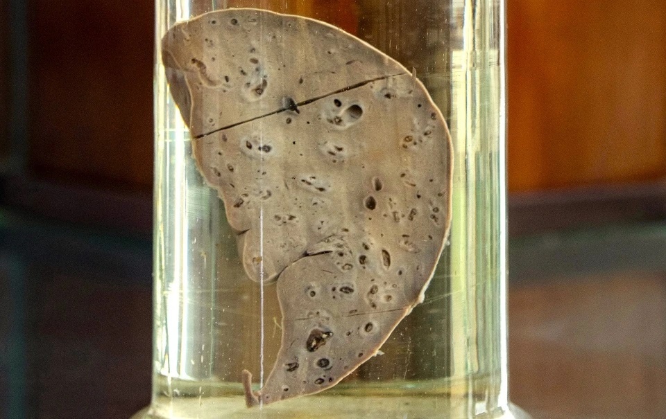 Mẫu vật gan người nhiễm sán được thu thập tại huyện Nghĩa Hưng (tỉnh Hà Nam Ninh, nay là tỉnh Nam Định) năm 1990 và trưng bày trong bảo tàng Viện Sốt rét - Ký sinh trùng - Côn trùng Trung ương. Ảnh: Việt Linh.