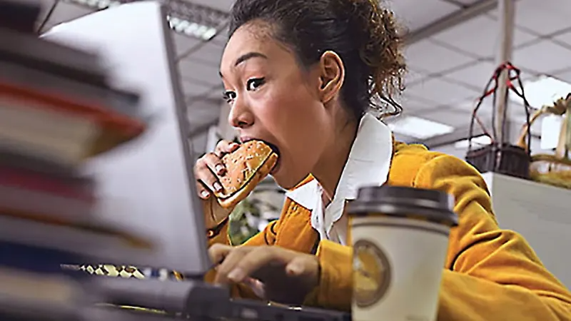 Sự phổ biến của các ứng dụng giao đồ ăn khiến bữa trưa văn phòng ngày càng "thịnh soạn" với đồ chiên rán, thức ăn nhanh, món nhiều kem và bơ. Những lựa chọn này giàu chất béo bão hòa và tinh bột tinh chế. Kết hợp với việc ngồi lâu, chúng làm tăng mỡ bụng, yếu tố liên quan chặt chẽ đến gan nhiễm mỡ.