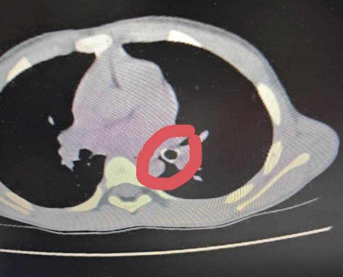 Qua thăm khám lâm sàng, các bác sĩ nghi ngờ trẻ hóc dị vật đường hô hấp, khả năng là đầu ngòi bút. Bệnh nhi được chỉ định chụp CT ngực, kết quả ghi nhận dị vật hình ống, bề dày thành khoảng 1,8mm, chiều dài khoảng 18mm, nằm tại phế quản thùy dưới trái, gây cản trở thông khí.