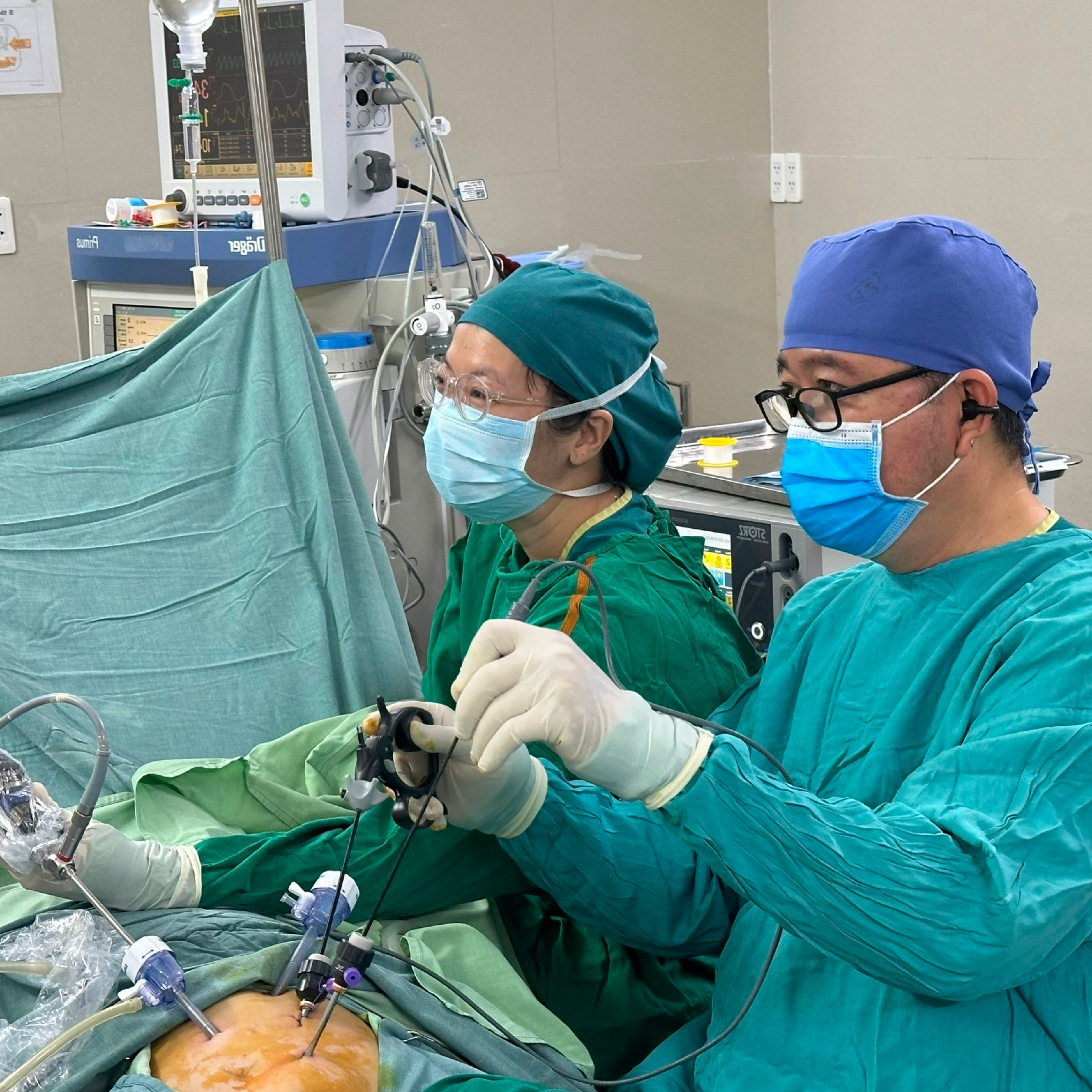 BS.CKII Phan Tấn Đức, Trưởng khoa Thận - Niệu Bệnh viện Nhi đồng 2 phẫu thuật nội soi lấy sỏi niệu cho bệnh nhi. Ảnh: BV