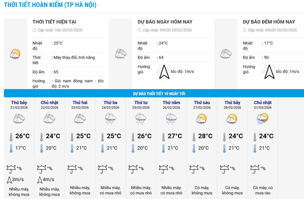 Từ ngày 24-25/2, do không khí lạnh tăng cường yếu lệch đông kết hợp với hội tụ gió trên cao, khu vực Hà Nội duy trì nền nhiệt ít biến động, trời nhiều mây, xuất hiện mưa nhỏ; đêm và sáng trời lạnh.