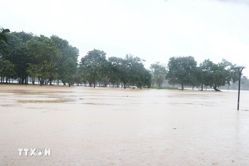 Mực nước trên sông Hương, thành phố Huế đang tăng dần khiến cồn Dã Viên bị ngập trở lại chiều 2/11. (Ảnh: Nguyên Lý/TTXVN)