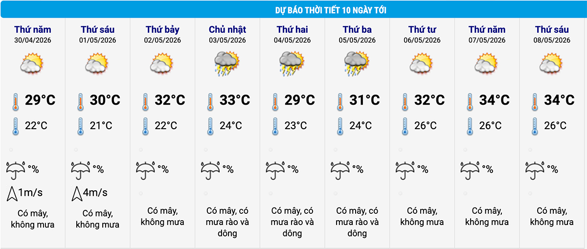 Theo đó, trong hai ngày đầu kỳ nghỉ lễ 30/4 - 1/5, nhiệt độ cao nhất ở khu vực này tăng nhẹ lên ngưỡng 29-30°C, nhiệt độ thấp nhất duy trì mức 21-22°C, trời có mây, không mưa.