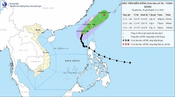 Diễn biến bão số 14, dự báo đến 19 giờ ngày 12.11, cơn bão số 14 Fung-Wong sẽ ở trên vùng ven bờ phía tây nam của Đài Loan (Trung Quốc), sức gió cấp 8-9, giật cấp 11, di chuyển theo hướng bắc đông bắc với tốc độ 10-15km/giờ và suy yếu dần. Khu vực chịu ảnh hưởng là vùng biển phía đông bắc khu vực Bắc Biển Đông với cấp độ rủi ro thiên tai là cấp 3.