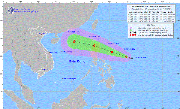 Trung tâm Dự báo khí tượng thủy văn quốc gia cho biết, hồi 19 giờ ngày 1.10, vị trí tâm áp thấp nhiệt đới ở vào khoảng 14,8 độ vĩ bắc; 129,8 độ kinh đông, trên vùng biển phía đông đảo Luzon (Philippines). Sức gió mạnh nhất vùng gần tâm áp thấp nhiệt đới mạnh cấp 7 (50-61km/giờ), giật cấp 9. Di chuyển theo hướng tây tây bắc, tốc độ khoảng 15km/giờ.