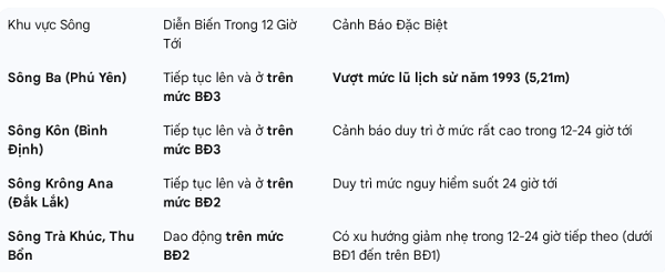 Trong 12-24 giờ tiếp theo, lũ trên sông Ba và sông Kôn (Bình Định) sẽ dao động ở mức rất cao và trên BĐ3. Sông Kôn (Bình Định) lũ tiếp tục lên và duy trì trên mức BĐ3 trong 12 giờ tới. Sông Krông Ana (Đắk Lắk) lũ tiếp tục lên và duy trì trên mức BĐ2 trong suốt 24 giờ tới. Sông Trà Khúc (Quảng Ngãi), sông Thu Bồn (Quảng Nam) trong 12 giờ tới lũ dao động trên mức BĐ2, sau đó có xu hướng xuống dần trong 12-24 giờ tiếp theo.