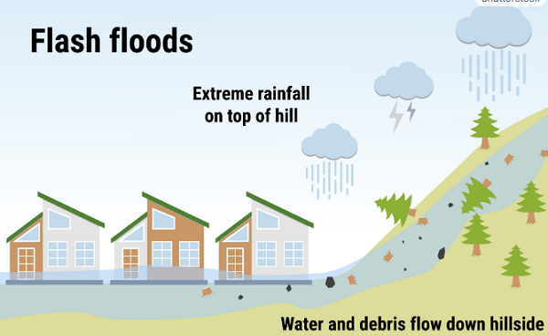 Hình ảnh minh họa lũ quét thường xảy ra đột ngột tại các suối và khe núi dốc, có sức tàn phá cực lớn. Sạt lở đất đe dọa trực tiếp đến tính mạng người dân sinh sống gần sườn đồi và gây tắc nghẽn giao thông.