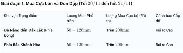 Các khu vực đô thị lớn như Đà Nẵng, Quy Nhơn (Bình Định), Nha Trang (Khánh Hòa) có thể xảy ra ngập sâu do hệ thống thoát nước không kịp xử lý lượng mưa lớn với cường suất >150 mm/3 giờ.