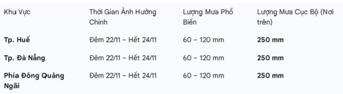 Cơ quan khí tượng dự báo đêm ngày 24.11 mưa vẫn tiếp diễn tại TP.Huế, TP.Đà Nẵng và phía đông các tỉnh từ Quảng Ngãi đến Gia Lai với lượng phổ biến 20-40mm, cục bộ trên 80mm. Từ ngày 25.11, mưa lớn ở Trung Bộ có xu hướng giảm dần về cường độ và phạm vi.