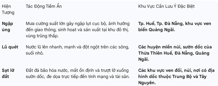 Cảnh báo nguy hiểm: Khả năng mưa có cường suất lớn hơn hoặc bằng 60mm/3 giờ, gây ngập úng sâu và đột ngột tại các khu đô thị lớn như Huế và Đà Nẵng.