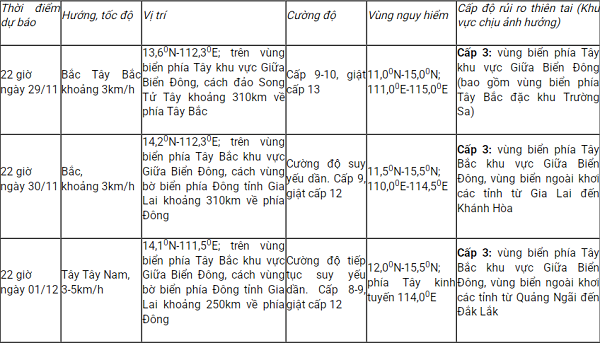 Theo cơ quan khí tượng, ATNĐ được dự báo sẽ mạnh lên cấp 7 ngay trong ngày 29.11, đạt đến ngưỡng mạnh nhất của ATNĐ. Vùng nguy hiểm là khu vực từ phía nam vĩ tuyến 9,5°N; trong khoảng kinh tuyến 104,0°E - 111,0°E là nơi tập trung các rủi ro thiên tai cao nhất.